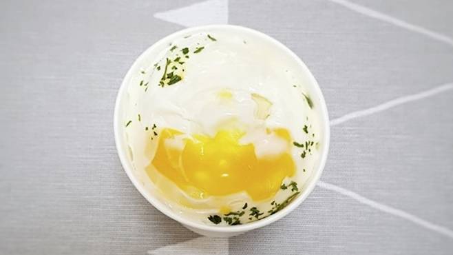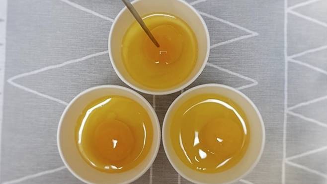 식용유가 발려진 종이컵에 반죽을 1/4 수준으로 넣어 주세요. 그리고 계란을 넣고 노른자를 젓가락으로 콕! 찔러 주세요. 만약 반죽을 많이 넣으면 넘칠 수 있어요.
