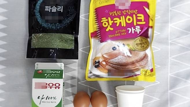 종이컵 기준 핫케익 가루 2컵, 우유 한 컵 계란 2개를 준비하세요. 기호에 따라서 소시지, 파슬리가루 등을 넣어도 좋은 것 같아요.