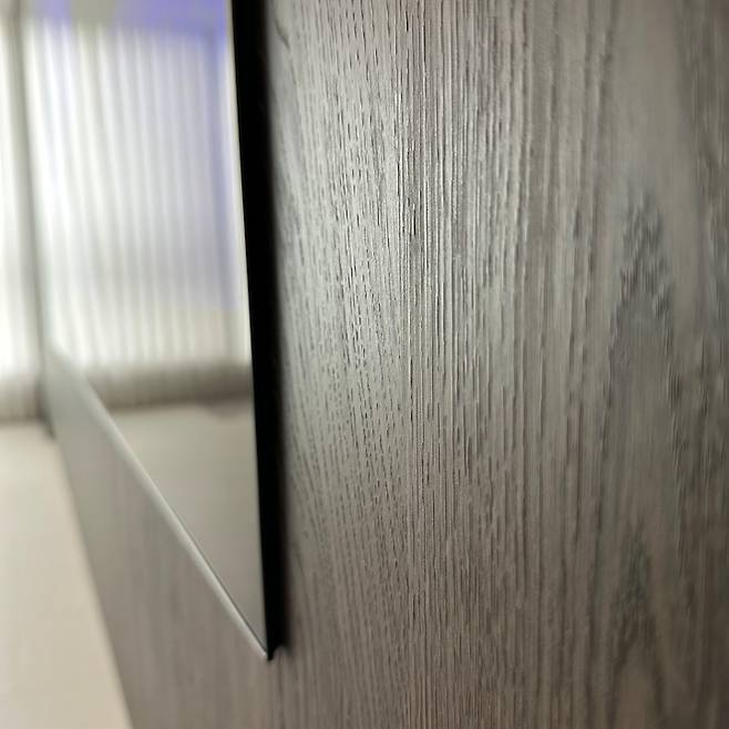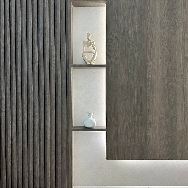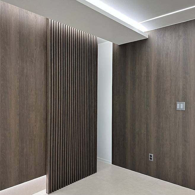 요즘 유행하듯이 그냥 선을 넣은 깔끔한 벽과 히든 도어로 구성할까 했는데 거실 확장을 하니 생각보다 거실이 넓어서 그렇게 하면 너무 단조로울 것 같더라고요. 그래서 평소에 하고 싶었던 간살들을 이용해서 깔끔하지만 포인트가 되는 아트월이 완성되었습니다.