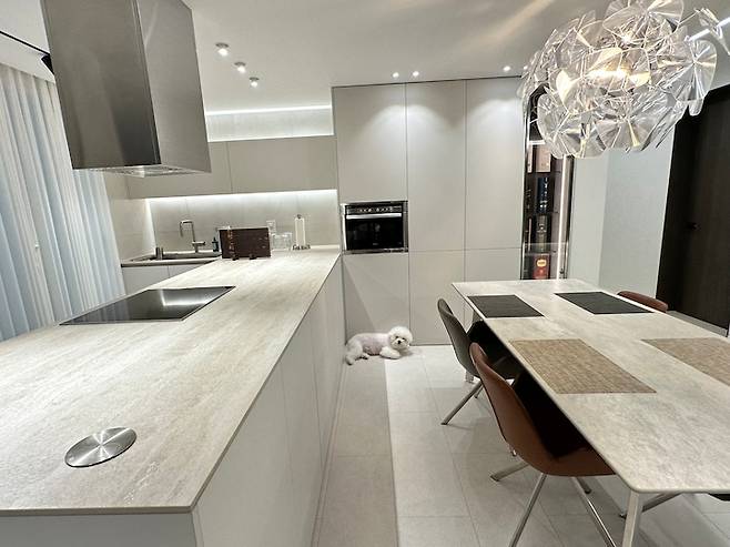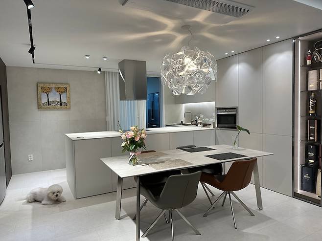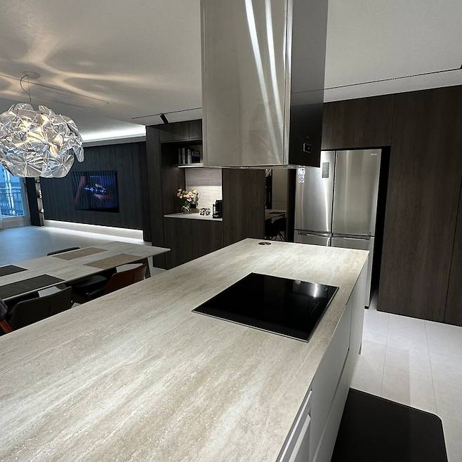 전체적인 모습은 대면형 주방을 원해서 이런 식으로 구성했습니다. 마음에 드는 식탁등 찾기가 어려웠는데 '루체플랜 호프 18' 제품을 발견하고 바로 선택했습니다.