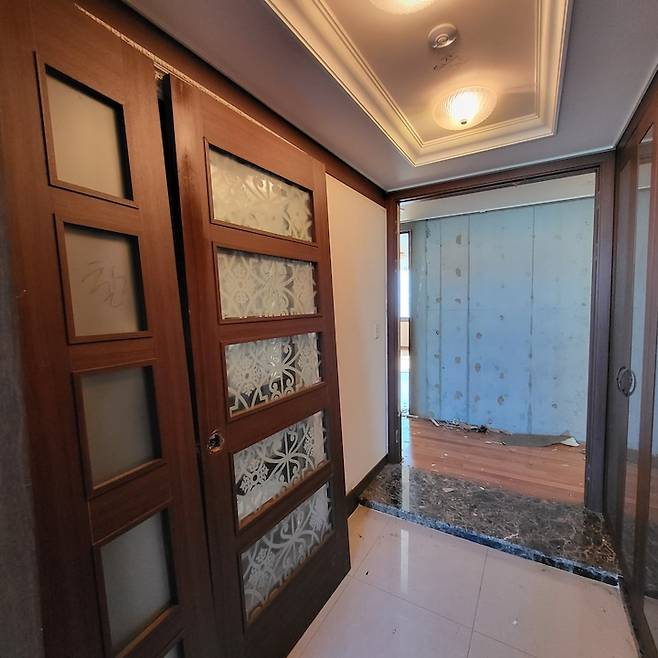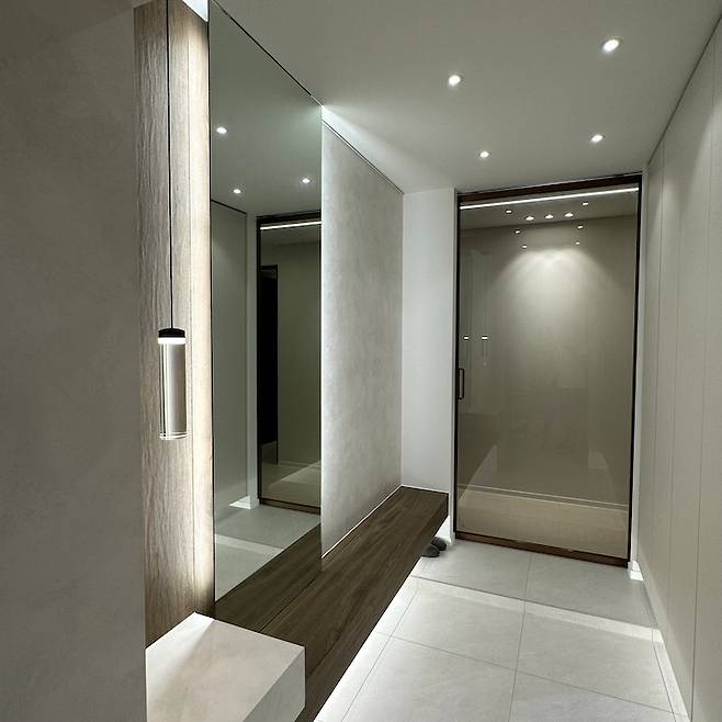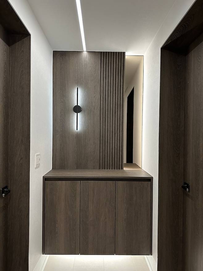 집의 첫인상인 현관과 전실 공간은 갤러리 같은 느낌이면 좋겠다는 것이 저희 가족의 니즈였습니다. 또한 그냥 예쁘기만 한 것이 아닌 실용적인 수납공간도 필요했어요. 기존 대문의 위쪽에 있던 불투명한 유리로 된 곳은 목공사를 통해 막고, 대문의 일부로 만들어 더욱 웅장해 보이게 연출했습니다.