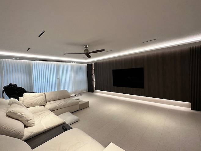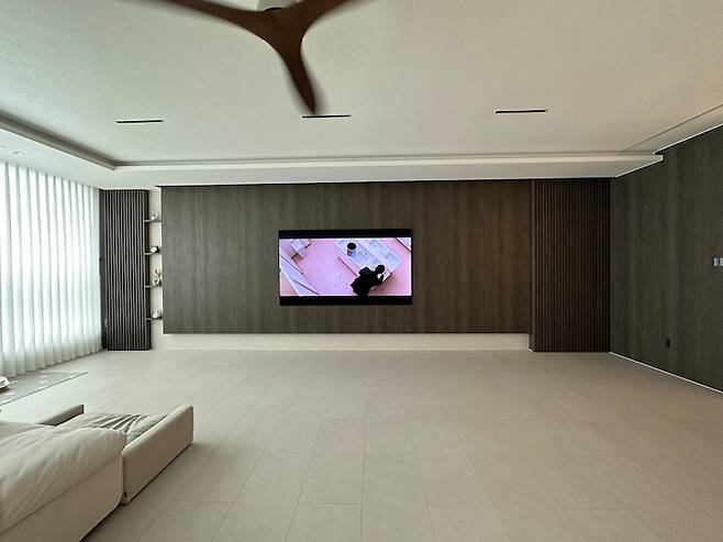 너무 마음에 드는 광경이에요. 레놀릿 세레나 오크 차콜 필름이 어두울까 굉장히 고민이 많았었는데 막상 하고 보니 모두가 너무 만족하는 고급스러운 아트월이 채워졌어요. 마루는 요즘 인기 많은 이모션 블랑 이에요!