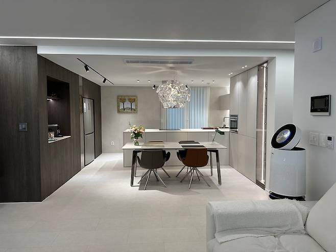 인테리어를 시작하며 부랴부랴 유튜브를 찾아보며 'ㄱ'자 구조가 비효율적이라는 내용을 많이 접했어요. 그래서 고민을 많이 했었는데 결과적으로 저희는 만족합니다. 안정적으로 느껴져서 좋아요.