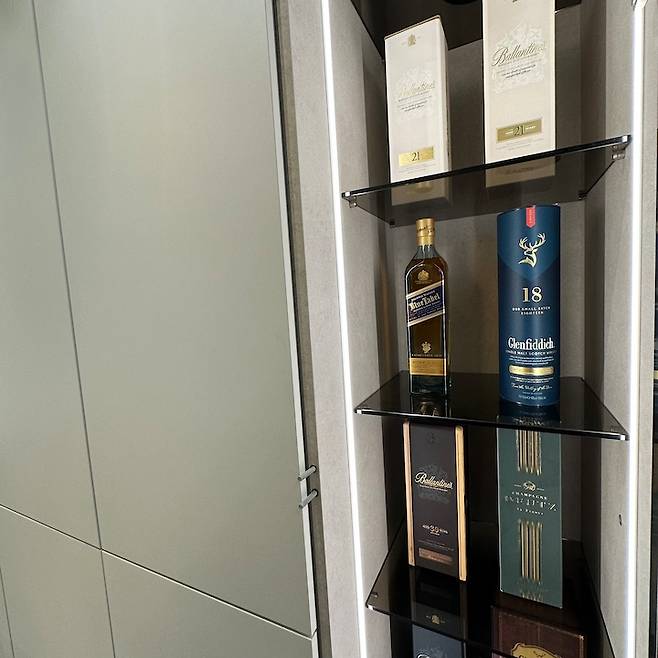 신경 써서 만든 유리 양주장이에요. 브론즈 유리를 사용하였고, 장 속의 색상을 그냥 문짝과 같은 색으로 하지 않고 돌과 같은 질감의 재료를 사용하여 제작했어요. 실제로 보면 훨씬 고급 지게 느껴집니다.