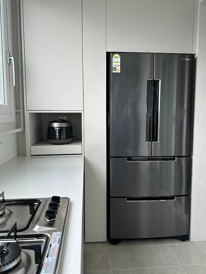 저희 집 주방을 구성할 때 가장 고민되는 부분이 냉장고 자리였습니다. 요즘은 키친핏으로 많이 하시는데 용량 때문에 엄마가 그건 안된다고 하시고, 큰 냉장고를 넣으려 하니 냉툭튀를 피할 수 없을 것 같더라고요. 고민하다가 저희는 아예 냉장고 집을 만들었어요.