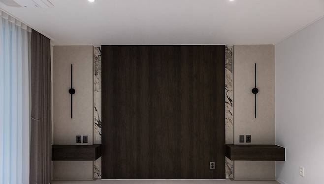 안방은 업체에서 침대 헤드를 제작해 주셨어요. 침대를 바꿀까 했지만 엄마 아빠는 아직 아끼시는 흙침대와 이별할 준비가 되지 않으셔서 일단 시몬스 kk 기준으로 침대 공간을 구성해 두고 제작했습니다.