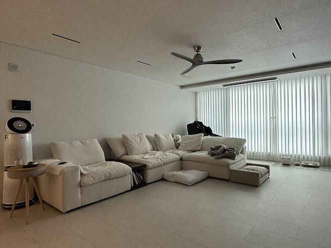 아빠가 엄청 아까워하셨지만 기존에 쓰던 짙은 가죽 소파는 과감히 없애고 사보고 싶었던 화이트 소파를 용감하게 구매하게 되었습니다. 강아지 때문에 고민되었는데 워낙 소파에 올라오는 걸 좋아하는 편이라.. 미안해서 강아지 소파를 따로 사주고서라도 사고 싶었던 화이트 소파!