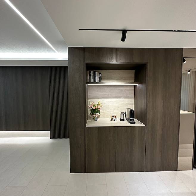Before 사진이 존재하지 않지만 유리장으로 구성되어 있던 부분이에요. 저희도 그냥 붙박이장을 해야 할지 그냥 포인트 벽으로 꾸며야 할지 고민이 많았죠. 작은 공간인데도 딱히 떠오르는 아이디어가 없더라고요. 그래서 업체에서 몇 가지 추천받은 디자인 중에 디자인과 실용성을 함께 충족할 수 있는 선택을 했어요.