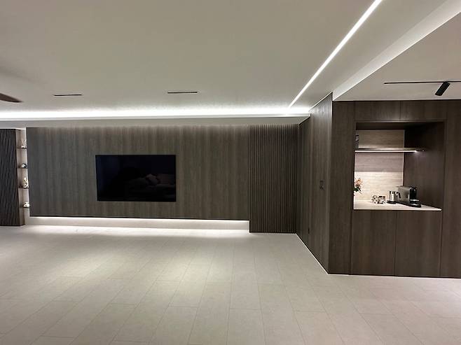 오른쪽 끝부분은 도배지로 구성되면 허전할 듯해서 깊이감 있게 브론즈경을 추가해달라고 요청했어요. 그리고 여기 끝에서부터 거실 아트월까지 길게 라인 조명을 설치했는데요. 괜찮을까 걱정했는데 생각보다 집도 밝혀주고 예뻐요!