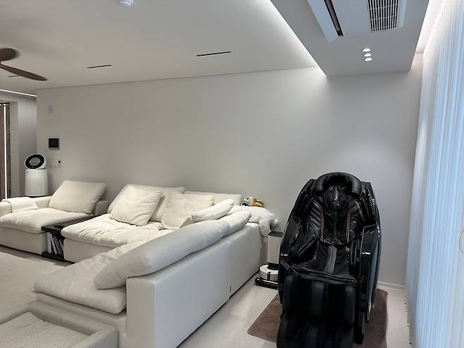 소파 사이즈가 작지 않은데, 거실을 확장하고 나니 생각보다 벽이 길어졌습니다. 그래서 소파를 한 칸 더 사야하나 고민이 들기도 했어요. 그러다 생각난 우리의 안마 의자 ㅎㅎ 안마 의자의 존재가 과연 인테리어에 맞나 고민했는데 안마 의자에 앉아서 TV 보는 시간을 포기하긴 힘들더라고요. 그래서 소파 공간 뒤쪽으로 안마 의자와 로봇 청소기까지 놓으니 딱 만족하고 있어요. 역시 편한 게 최고입니다.