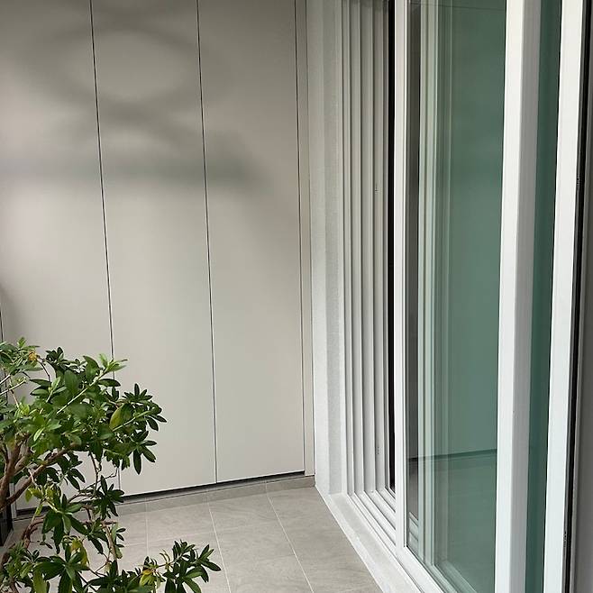 뒷베란다는 너무 큰 샷시문으로 되어 있어서 보일러 연통까지 다 보이는 구조더라고요. 확장을 다하고 더 넓게 만들까 하다가, 쓰레기 두는 공간이나 빨래 공간도 필요해서 고민 끝에 이 부분은 확장을 진행하지 않았어요.