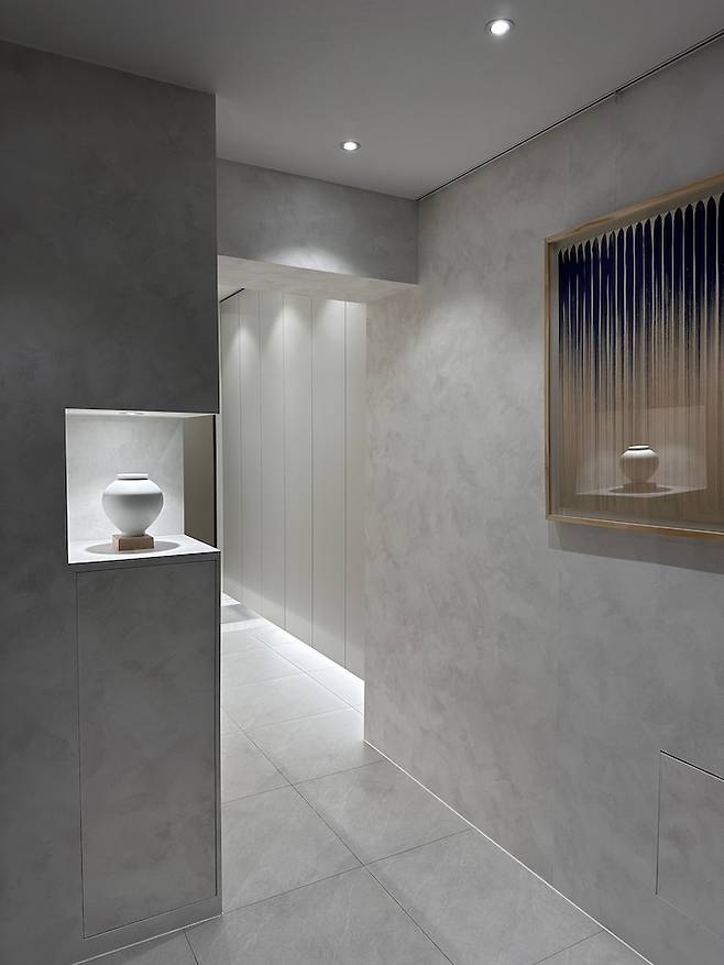 그냥 가벽을 세워버리기엔 기존 공간이 아까워서, 가운데 정사각 형태의 공간을 주어 달항아리 오브제를 전시했어요. 이 공간의 오브제와 대문을 열자마자 보이는 그림 때문인지 방문하는 손님들마다 갤러리에 들어오는 느낌이 든다고 해서 뿌듯했습니다.