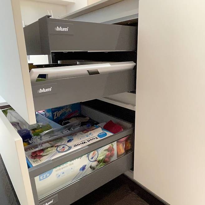 아일랜드 안쪽의 서랍장 모습이에요. 서랍장 또한 모두 blum 제품으로 선택했는데, 튼튼해서 좋아요!