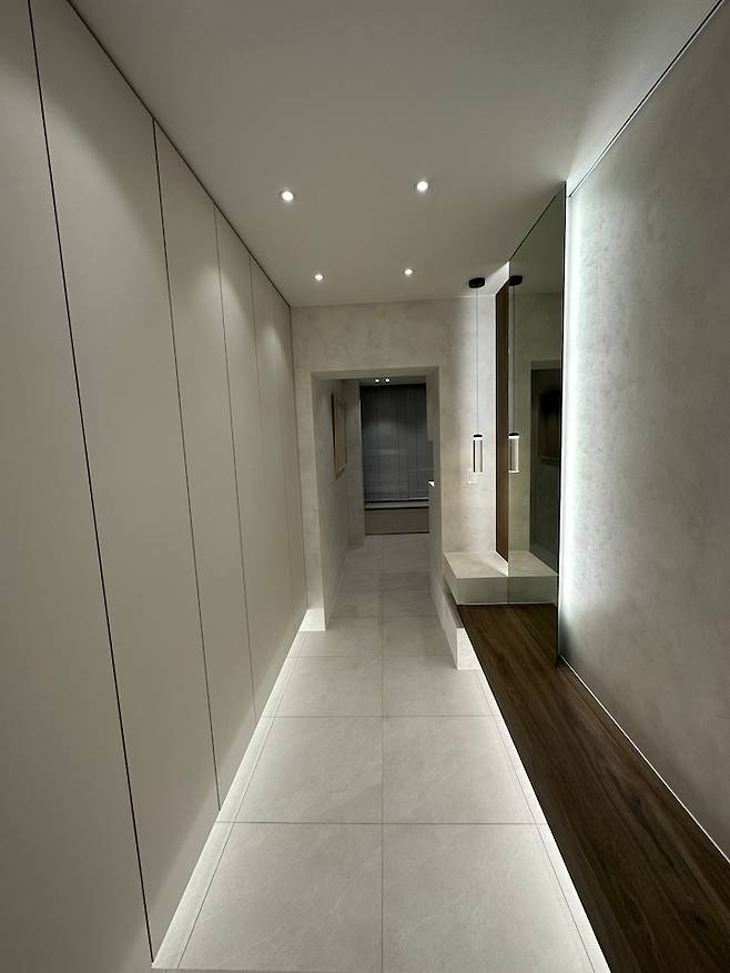 오른쪽 끝부분은 도배지로 구성되면 허전할 듯해서 깊이감 있게 브론즈경을 추가해달라고 요청했어요. 그리고 여기 끝에서부터 거실 아트월까지 길게 라인 조명을 설치했는데요. 괜찮을까 걱정했는데 생각보다 집도 밝혀주고 예뻐요!