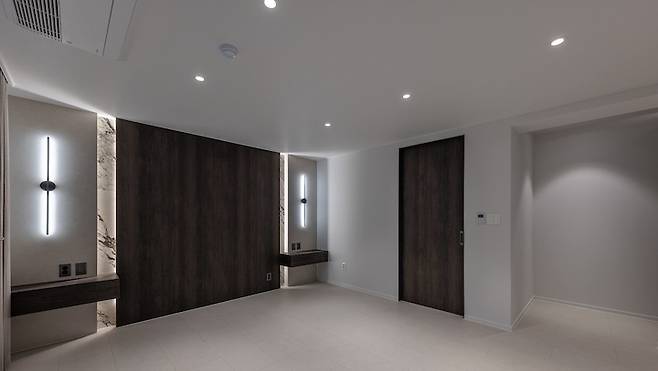 안방에 들어가는 입구에 가벽을 세웠어요. 이 과정에서 문은 요즘 유행하는 히든 도어 형식으로 할까 고민했는데, 저희 집 서열 1위인 구름이가 자유롭게 드나들기에는 문을 고정하는 것이 걱정되었어요. 그래서 구름이의 편의성을 위해 만장일치로 슬라이딩 도어를 하기로 결정했습니다.