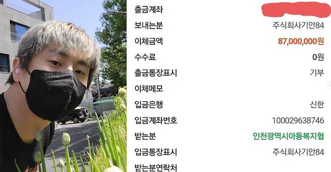 그는 유튜브 채널 ‘인생84’를 통해 보육원 아이들 60명에게 1인당 100만 원씩, 총 6,000만 원을 기부했다.