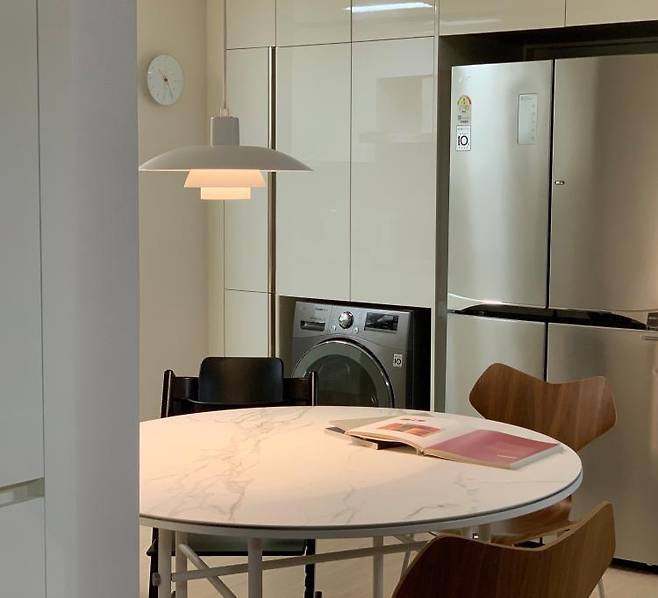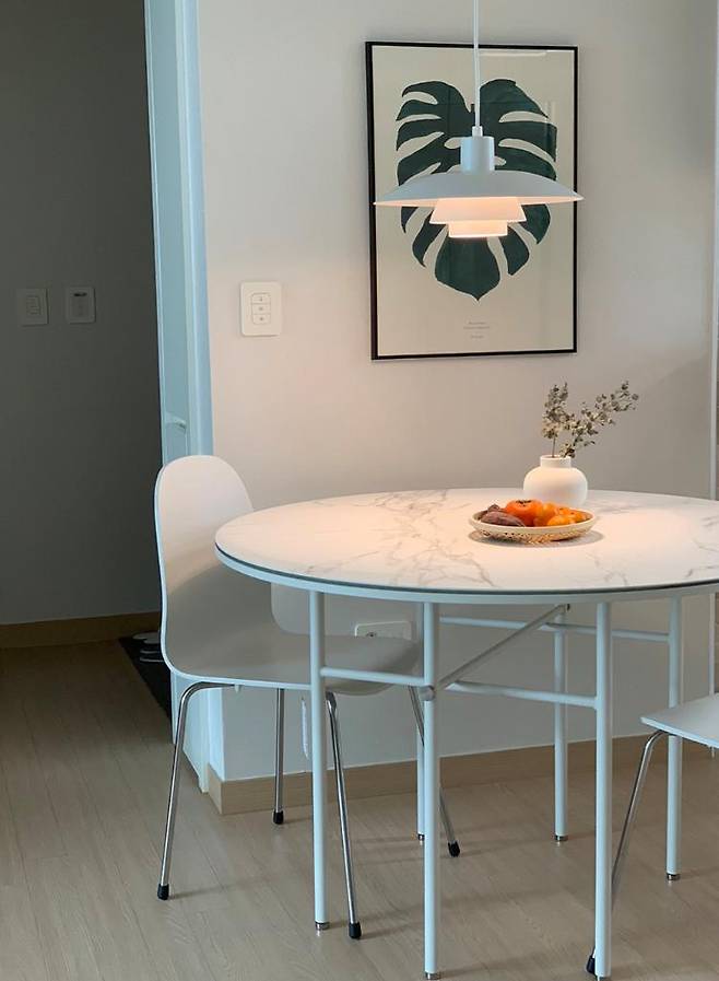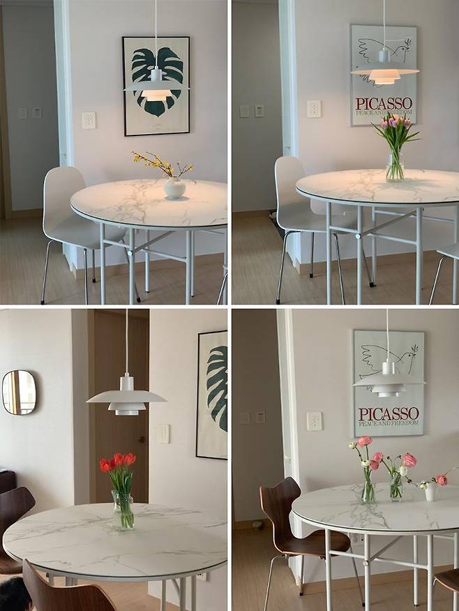 일반 사각 식탁은 작은 사이즈가 아니면 가족이 벽보고 밥을 먹어야 하는 구조라 원형 식탁을 놓았어요.