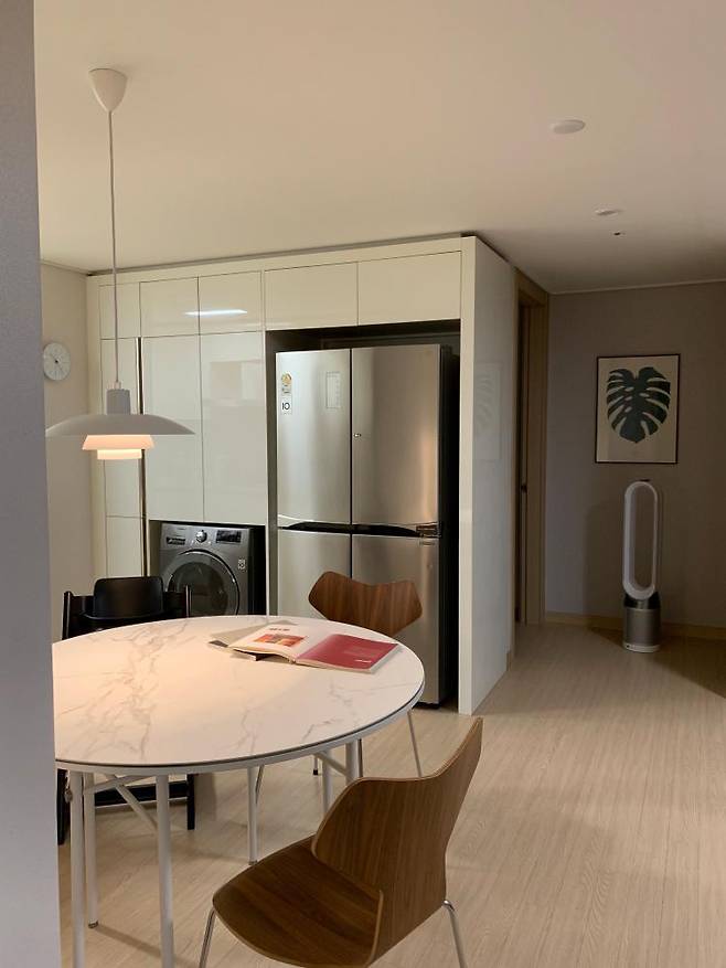빌트인으로 냉장고가 있고 옆엔 세탁기가 있어요. 맞춤으로 제작한 거처럼 딱 맞게 들어가네요.ㅎㅎ
