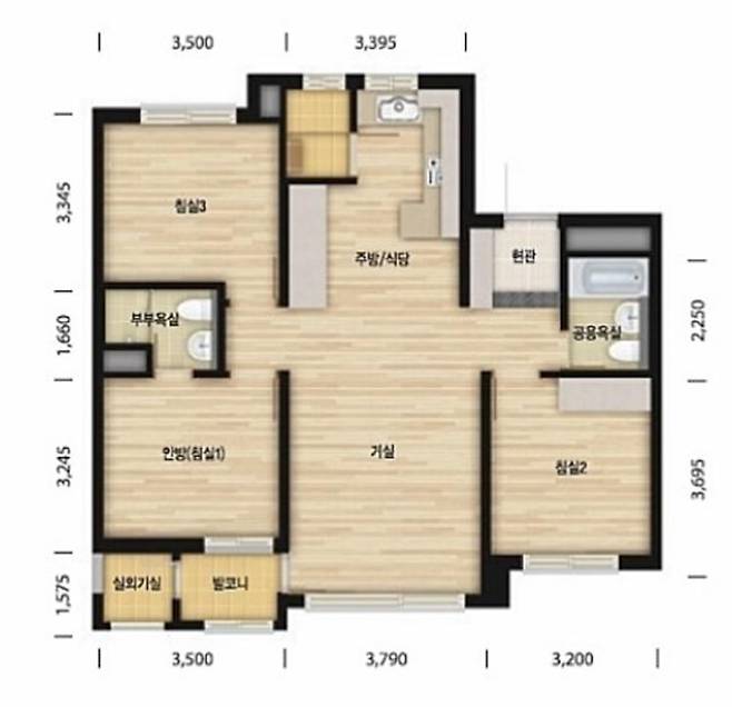 안방에서 아기와 세 식구가 잠을 자고, 침실 2는 아기 장난감방, 침실 3는 드레스룸입니다.