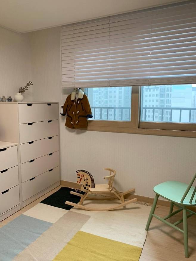 아기 옷, 목마 하나가 더 있을 뿐인데 아기방 느낌이 가득하죠.