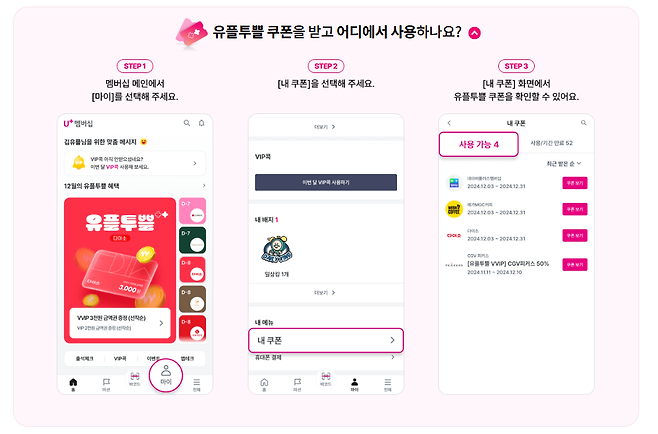 LG U+ 스마트폰 요금제 사용자라면 U+멤버십 앱 내 ‘유플투쁠’ 메뉴를 통해 다양한 제휴 쿠폰과 이벤트에 참여할 수 있어요. 매달 선착순으로 업데이트되는 할인 혜택은 외식·커피·뷰티·레저 등 분야별로 제법 알차게 구성돼서, 평소 자주 쓰는 앱 하나로 재미와 혜택을 동시에 누리기 좋아요.