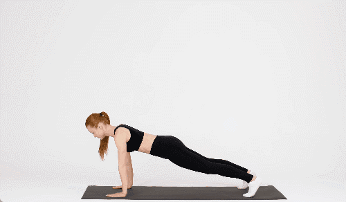 매트에 플랭크 기본자세로 엎드린 후, 먼저 오른쪽 팔꿈치를 구부리고 이어서 왼쪽 팔꿈치를 구부려 팔꿈치 플랭크 자세로 전환합니다. 그런 다음 팔꿈치를 하나씩 펴며 원래의 플랭크 자세로 돌아옵니다.