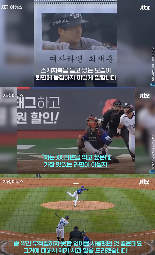 KBS N 스포츠 중계 중이던 이기호 캐스터는 한화 팬이 들고 있던 ‘여자라면 최재훈’ 스케치북을 보고 “저는 여자라면을 먹고 싶은데요. 가장 맛있는 라면이 아닌가요?”라고 말했다. 이 발언은 그대로 생방송에 나가며 즉각 논란이 됐다.