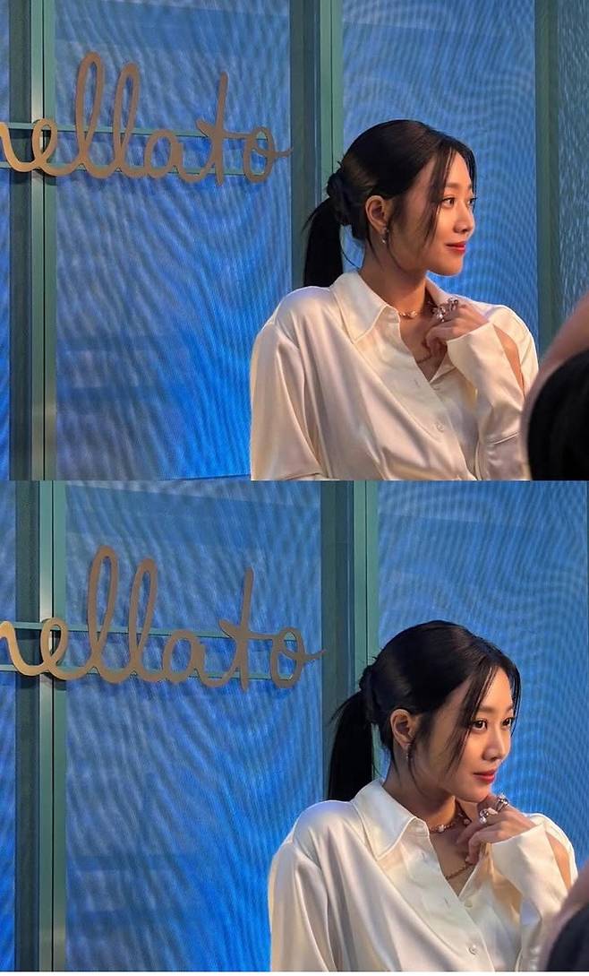 광택감 있는 아이보리 새틴 셔츠 드레스를 착용해 고급스러우면서도 여성스러운 분위기를 연출했습니다.