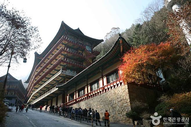 충청북도 단양군 영춘면 깊은 골짜기 안에 자리한 구인사는 소백산 연화봉 아래 자리한 거대한 산중 사찰이다. 위에서 내려다보면 마치 붉게 물든 단풍 사이로 흰 기와 건물들이 거대한 용처럼 길게 누워 있는 모습이 장엄하다.