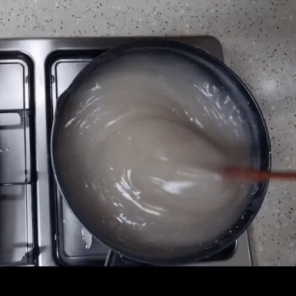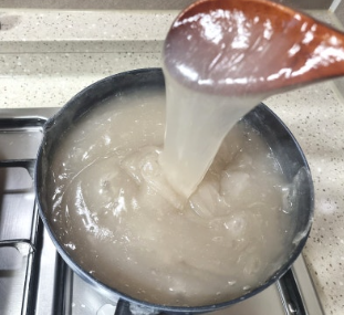 처음에는 젓기 빡빡하지만 점점 부드러워지고 색이 투명해집니다.