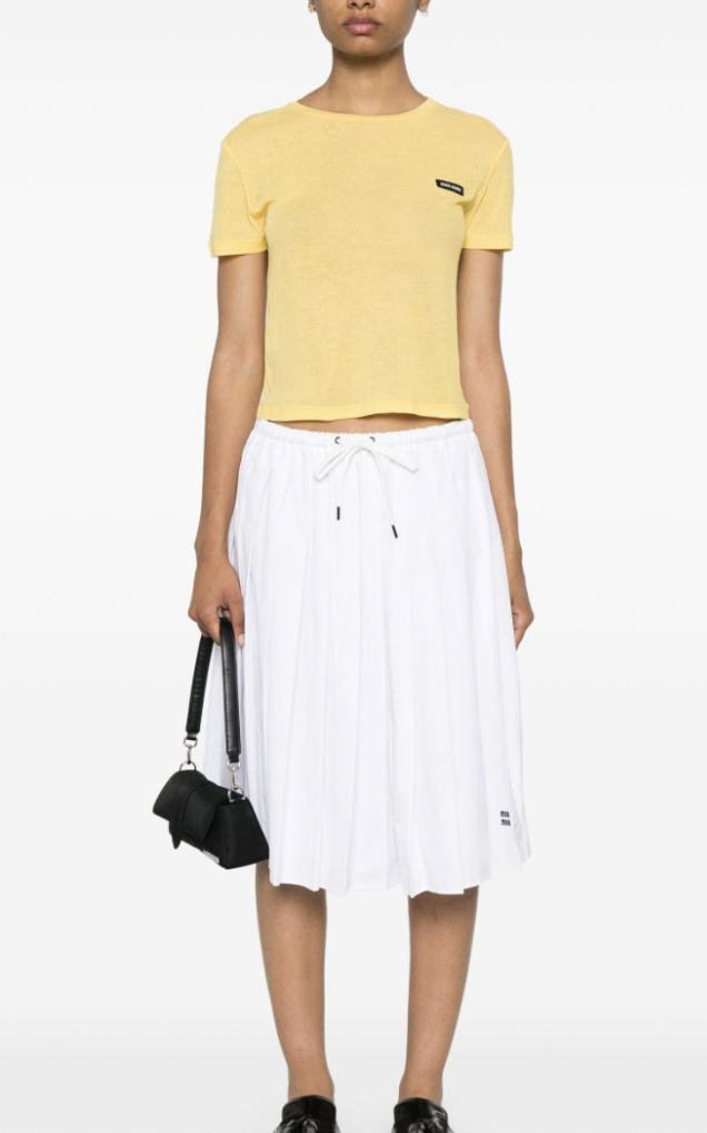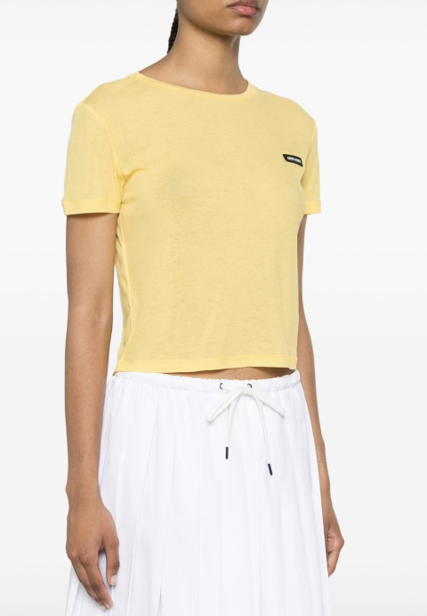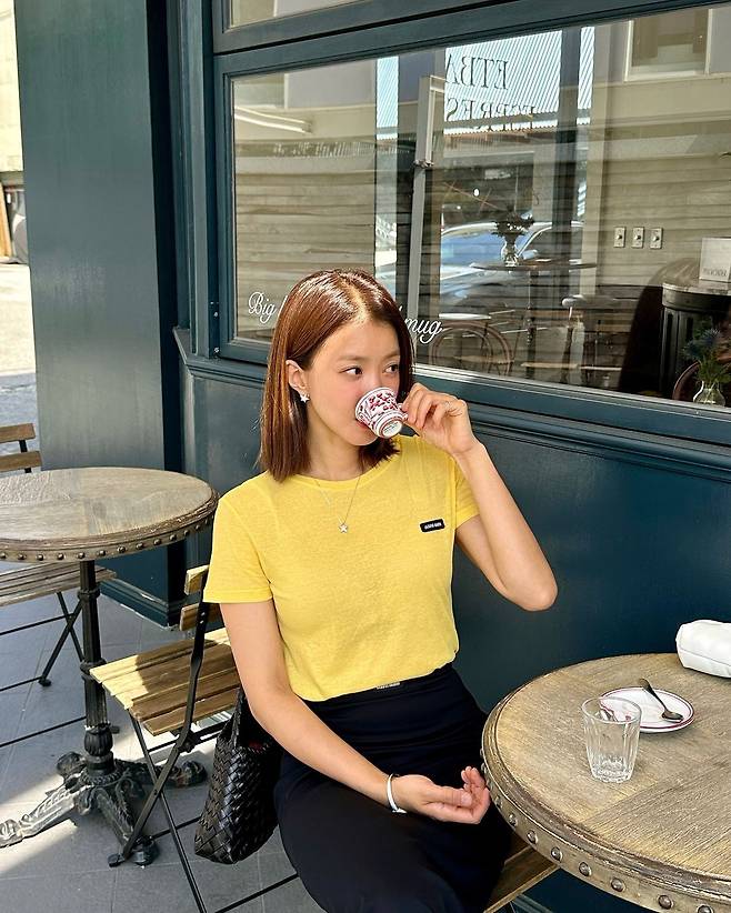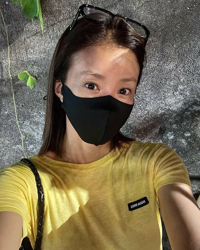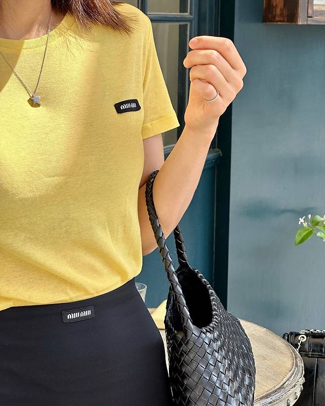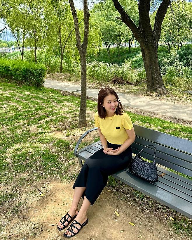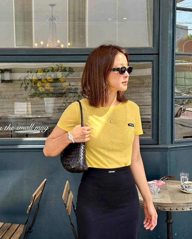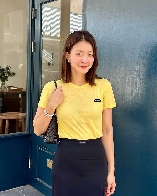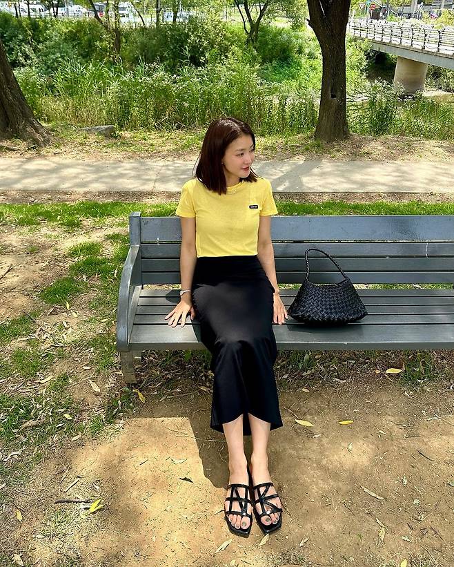 사진 속 이시영은 노란 반팔티와 블랙 H라인 스커트를 입고 샌들과 블랙백을 매치하여 깔끔한 데일리룩을 선보였다.