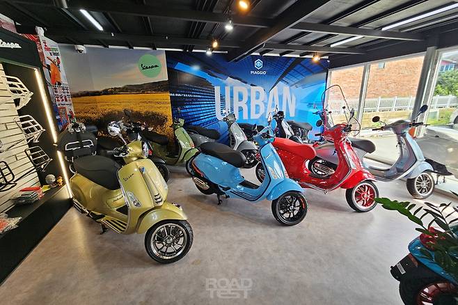메인 전시장은 기존 창고였던 공간을 완전히 탈바꿈시켜 만들었다. 내부를 가득 채운 형형색색 베스파들. 입장과 동시에 눈이 즐겁다. 지난해 발표한 스프린트 125×저스틴 비버 협업 모델도 만나볼 수 있었다. 한쪽 벽에는 앞뒤 캐리어와 탑 박스, 가방 등 정품 파츠를 전시해 각자에게 필요한 옵션을 직접 확인할 수 있다.