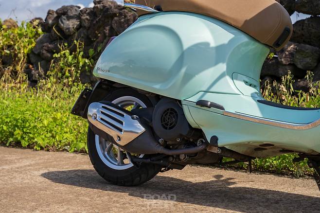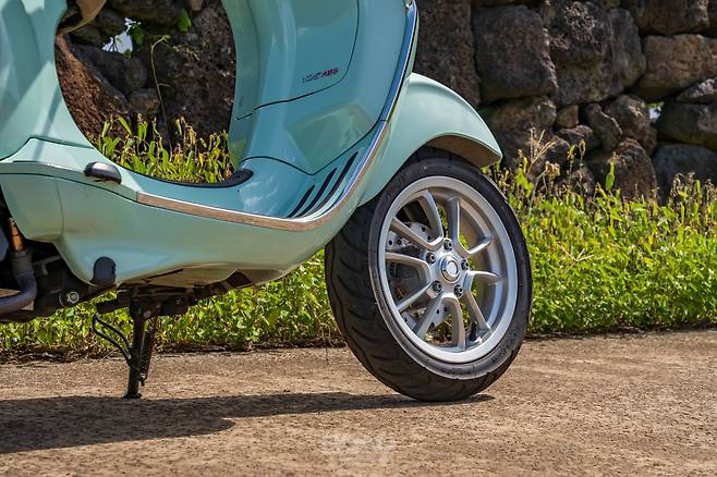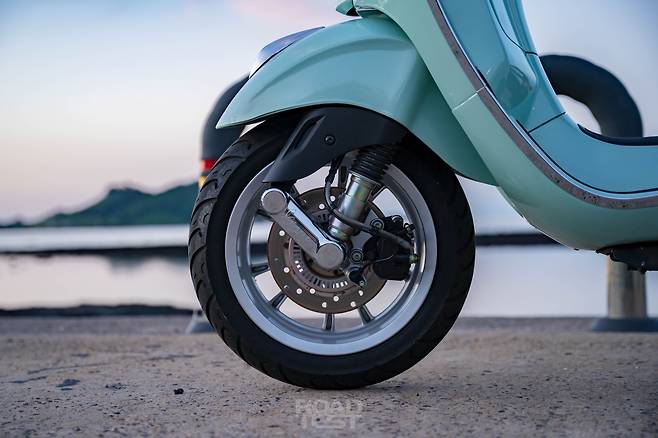 드디어 그린 릴랙스(Green Relax) 컬러의 프리마베라 125를 만났다. 이름은 그린이지만 흔히 아는 민트색에 가깝다. 디자인은 클래식 그 자체. 원형 헤드램프와 사이드미러, 부드러운 유선형 차체, 카울 양쪽을 두른 크롬 장식, 밝은 갈색 시트가 조화롭게 어울린다. 한쪽 면이 훤히 드러난 휠도 마찬가지. 모기업 피아지오가 과거에 만들던 항공기 바퀴로부터 영향을 받은 디자인이다.