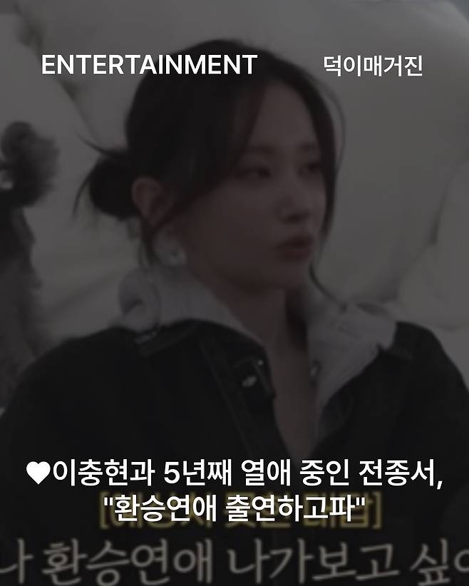 이날 전종서는 "해보고 싶은 작품이나 매력적인 배역이 있었냐"고 묻자 "나 '환승연애' 나가보고 싶다. '흑백요리사'나"라고 답했습니다. 그러면서 "'환승연애' 나가고 싶다고? 너 너무 오래 만났니?"라고 물었습니다. 전종서는 "내 연애를 대상으로 '환승연애'를 나가고 싶다는 게 아니다. 미친 프로그램이지 않나. 미쳤다"며 프로그램을 향한 애정을 드러냈습니다.