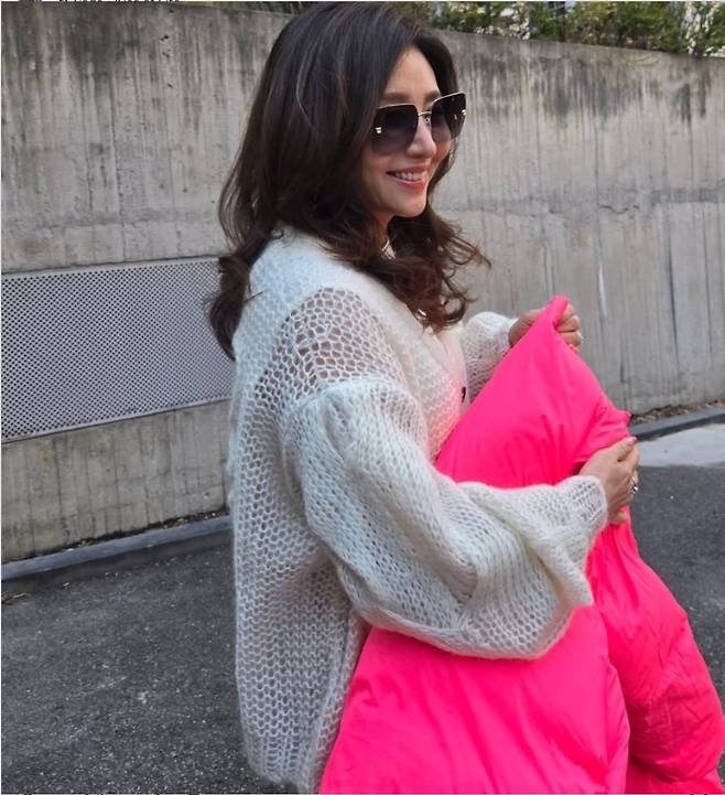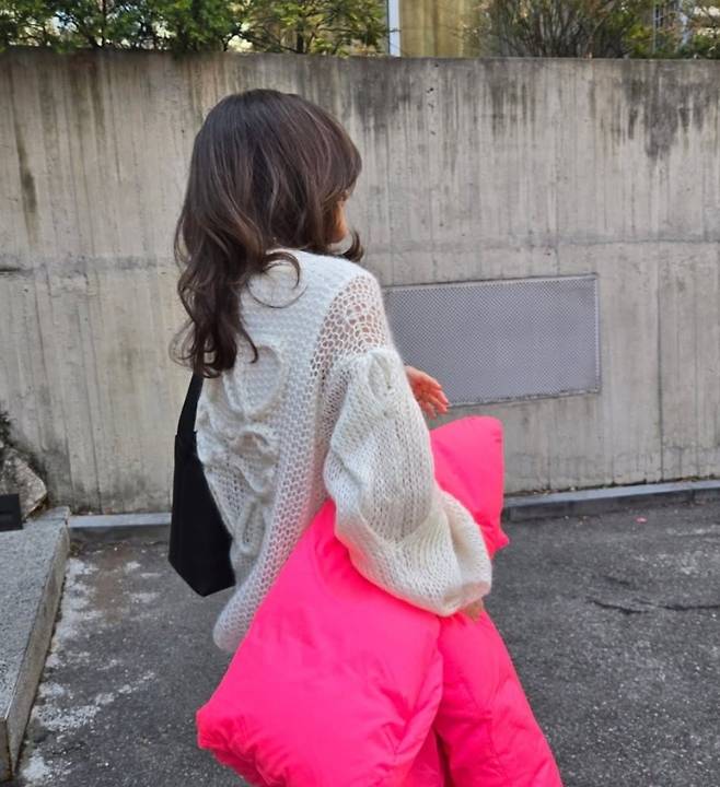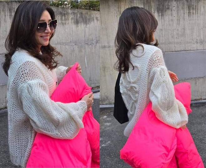 최명길은 루즈한 핏의 아이보리 컬러 니트에 트렌디한 볼륨감이 돋보이는 네온 핑크 패딩을 매치하며 강렬한 컬러 포인트를 더했습니다.