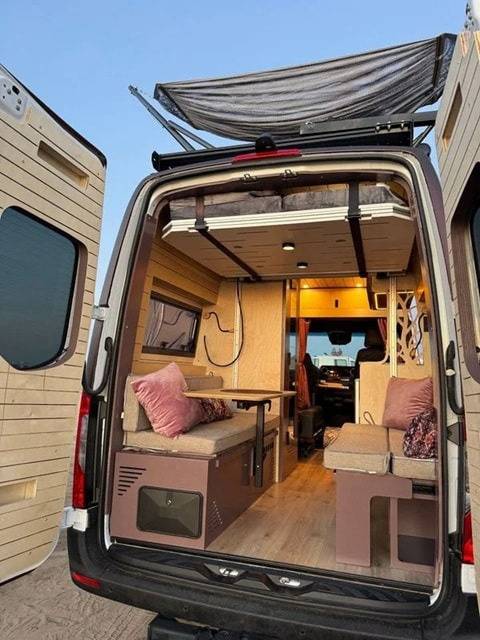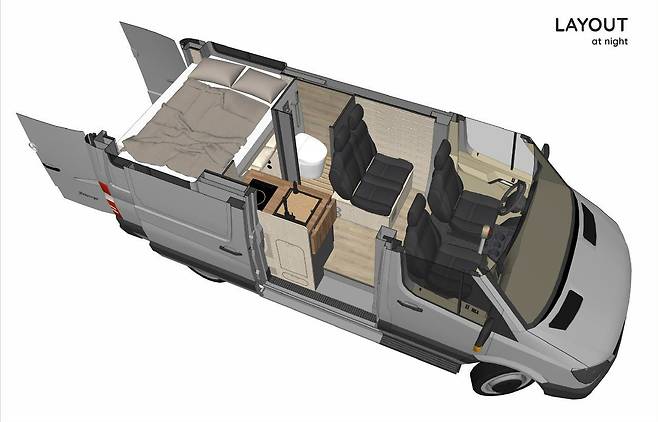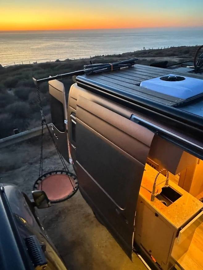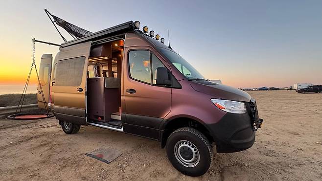 이번에 선보인 차량은 2022년형 메르세데스-벤츠 스프린터(144인치 휠베이스, AWD)를 기반으로 제작됐다. 우선, 외관은 메탈릭 버건디 컬러로 마감해 개성을 살렸으며, 루프탑에는 휴식용 해먹과 테라스 공간을 마련해 차별화했다.