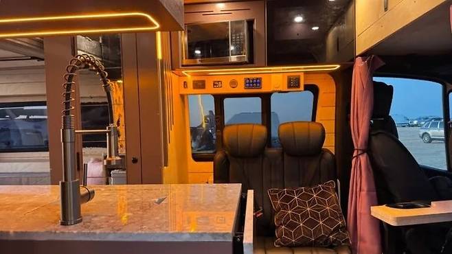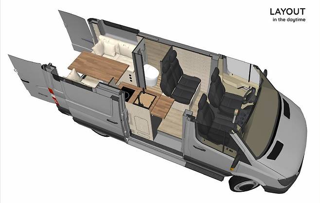 주방은 인덕션과 전자레인지, 대형 싱크대, 냉장·냉동고를 갖췄으며, 외부에서 사용할 수 있는 접이식 조리대도 마련됐다. 욕실에는 알루미늄 샤워부스와 이동식 변기가 설치돼 있어 장거리 여행에서도 생활 편의성을 확보했다.