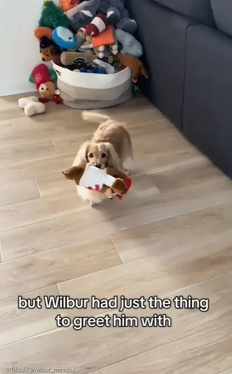 [노트펫] 인형을 물고 문 앞에서 아빠를 기다리는 닥스훈트가 네티즌의 마음을 녹였습니다.