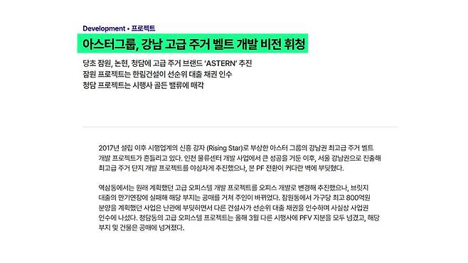 문제는 프로젝트의 본체인 초호화 주택단지 사업이 지지부진하다는 것. 해당 사업에는 브릿지 대출, 그러니까 장기 건설대출 전 중간단계로 짧게 높은 금리로 단기대출한 돈이 왕창 투자돼 있었다. 그런데 부동산 불황이 닥치면서 대출이 막혔고,공사는 이미 시작했는데 나가는 이자를 감당할 수 없게 된 거다.