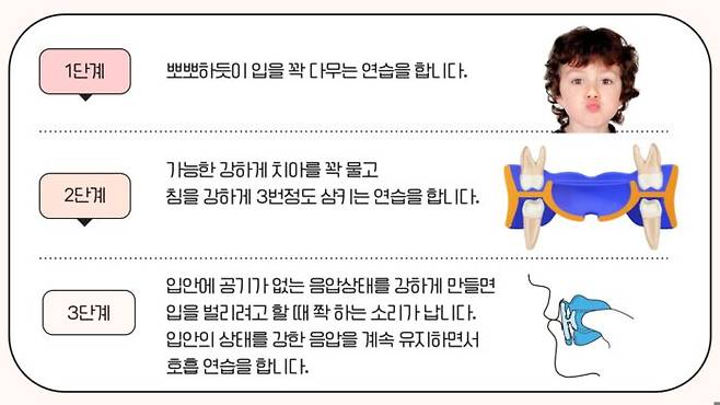 코로 호흡을 잘 하기 위해선 평상시 연습이 필요하다. 이미 입이 돌출되고 아래턱이 작은 부정교합인 데다 잘 때 편안히 입을 다물기 어려운 아데노이드형 얼굴이라면 더 그렇다.