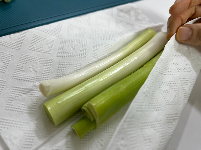 대파는 뿌리를 제거하고 가볍게 물에 씻습니다. 물에 세척하는 경우 물기가 완전히 날아갈 때까지 충분히 말리거나, 키친타월 등으로 꼼꼼하게 물기를 제거하세요.