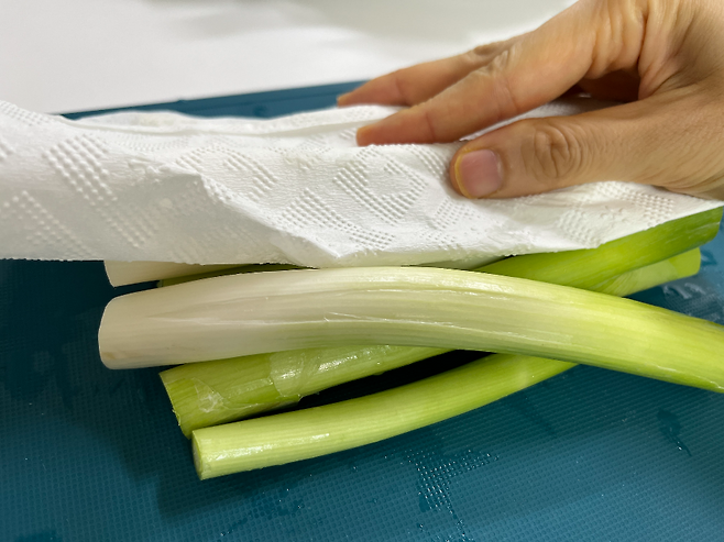 키친타월에 대파를 싸서 보관하면 대파 표면의 수분을 적절히 조절해 주어 싱싱한 상태를 더 오래 유지할 수 있습니다.