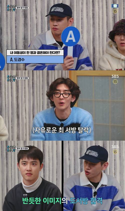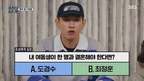 이날 방송에서 제작진은 크러쉬에게 "여동생이 한 명과 결혼해야 한다면? 도경수 vs 최정훈"이라고 물었다.