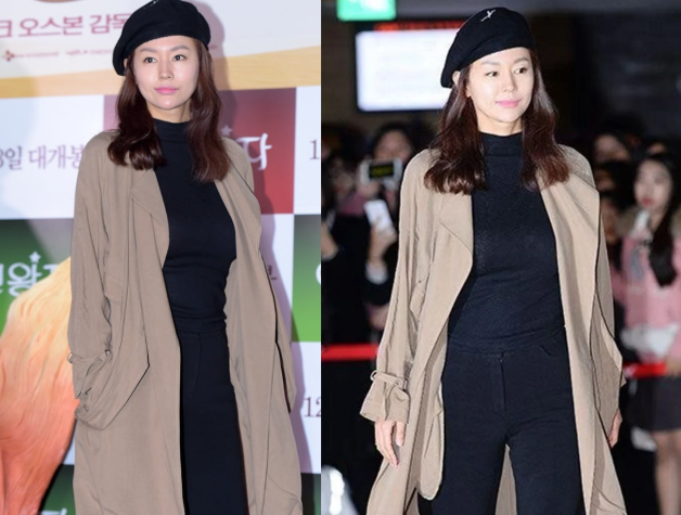 서유정은 베이지 롱트렌치코트에 검정색 터틀넥과 검정색 스키니진을 매치하여 세련되면서도 클래식한 가을 스타일을 선보였습니다. 검정색 베레모로 룩에 멋스러운 포인트를 더하며, 전체적으로 고급스러우면서도 편안한 느낌을 주었습니다.