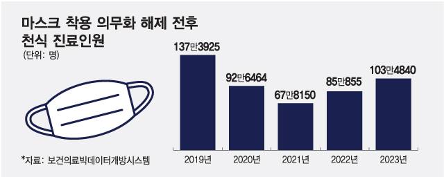 이후 마스크 착용 의무화가 해제(2023년 3월)된 2023년엔 천식 진료 인원이 103만4840명으로 52.6%포인트 늘었다.