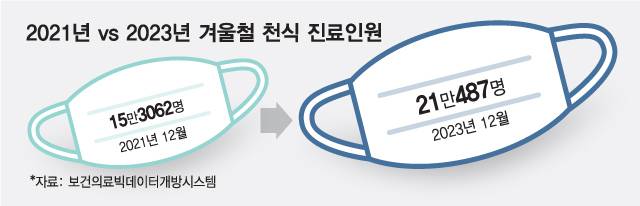 하지만 천식 환자 가운데 '마스크를 착용하면 숨쉬기 힘들다'는 이유로 겨울철 외출할 때 마스크를 착용하지 않는 경우가 적잖다. 이는 결국 기관지를 붓게 하고, 천식이 더 악화하는 악순환으로 이어질 수 있다. 실제로 마스크 착용이 의무화한 2021년 12월 천식 진료 인원은 15만3062명이었지만, 의무화 해제 후인 2023년 12월엔 21만487명으로 37.5%포인트 증가했다.