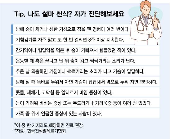 천식은 특정한 유발 원인 물질에 노출됐을 때 알레르기 염증 반응으로 기도에서 폐로 연결되는 통로인 '기관지'가 심하게 좁아지는 만성 호흡기 질환이다. 기관지가 좁아져 가슴을 조이는 듯 숨이 차고, 기침을 발작하듯 심하게 한다. 이런 기침은 낮보다 밤에 더 심해진다.