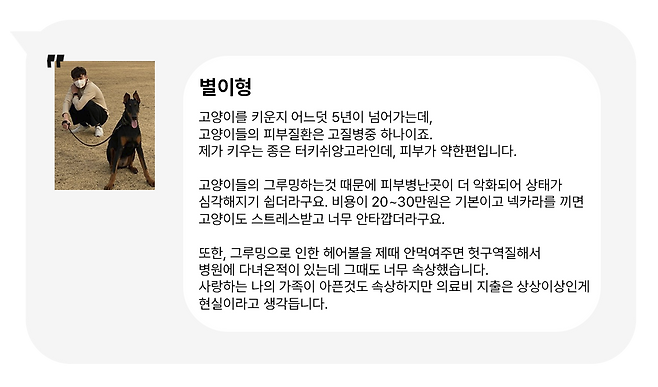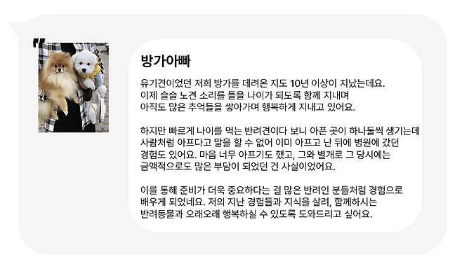 반려동물의 경우 사람처럼 아픈 곳이 있을 때 말하지 못하기에 병원에 가면 다양한 검사를 통해 이를 알아내는 수밖에 없는데요. 그러다 보면 자연스레 진료비도 높아집니다. 특히나 아이가 커갈수록 병원 갈 일은 잦아지고, 지출 비용은 그만큼 증가할 거예요.