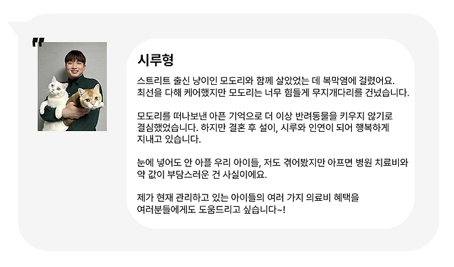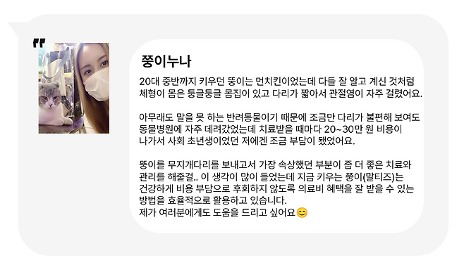 펫보험을 대신해 아이가 아플 때를 대비해서 적금 등의 방법으로 돈을 모아두는 선택을 하시는 반려인들도 많으세요! 물론 개인의 선택이지만, 저축으로 모으는 금액의 경우 막막함을 느끼게 될 수도 있어요. 왜냐하면 아이의 치료가 장기화되거나 주기적인 수술, 약물치료를 병행하게 된다면 반려인처럼 나라에서 받는 의료보험 혜택, 특례가 없기 때문인데요. 그렇기에 그동안 모은 금액보다 큰 금액이 지출될 수 있어요.