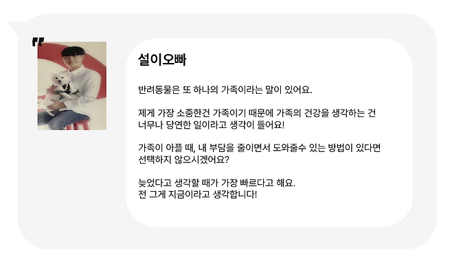 오늘은 반려인 니즈(성향)에 따른 펫보험에 대해 알아보았는데요. 사실 펫보험은 아이의 나이, 품종, 기저 질환에 따라 맞는 보험이 다를 수 있어요. 그렇기 때문에, 전문가와의 상담을 통해 아이에게 적합한 펫보험을 가입하는 것을 추천드려요. 각 보험사를 알아보고 비교하는 것은 생소하다 보니 소요되는 시간이 길 수밖에 없어요. 또한, 가입을 하더라도 어떻게 보장받는지에 대한 고민과 선택에 대한 심적 부담감이 존재하니까요!